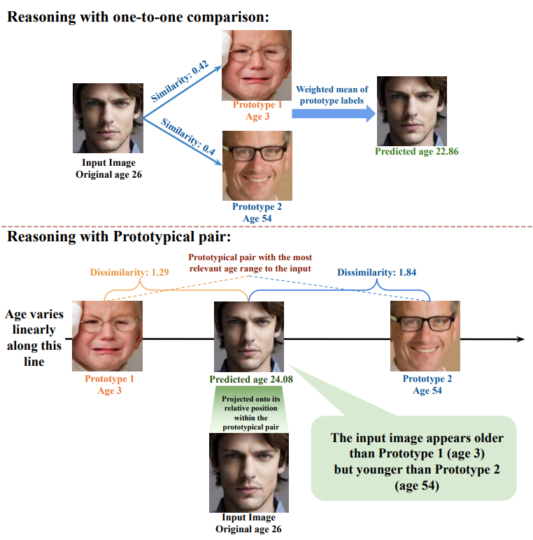 This paper propopses an interpretable alorightms with prototypical pairs for tasks with continuous labels. This algorithm is further evaluated in Reward Prediction (RL settings) and Age predictions (Classical Regression tasks).